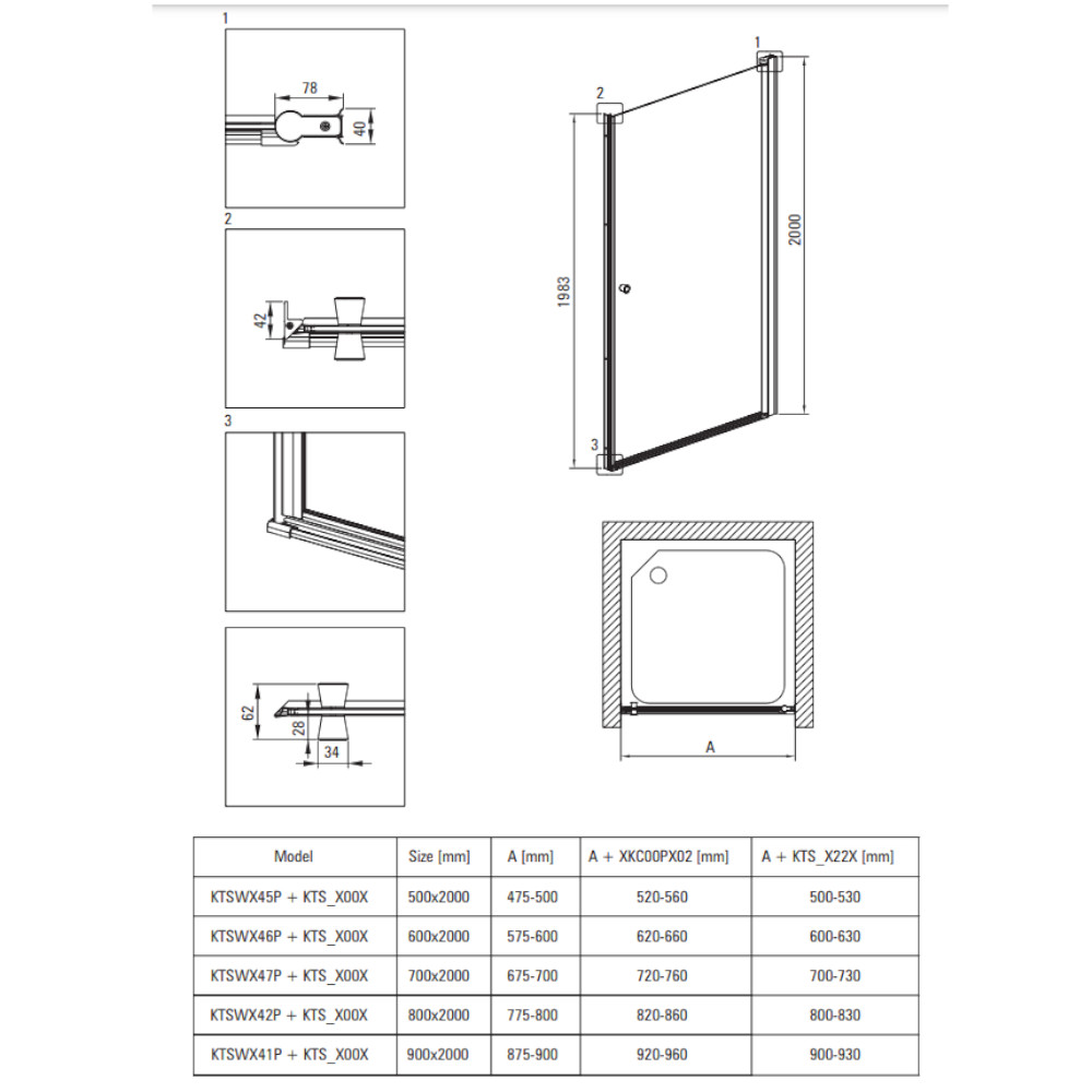 Drzwi prysznicowe wahadłowe wykonane zostały z transparentnego szkła hartowanego Totalwhite. Pokryte są powłoką Active-cover, która dzięki właściwościom hydrofobowym ułatwia utrzymanie kabiny w czystości. Jest to model odwracalny, tzn. z możliwością montażu na prawą lub lewą stronę. Drzwi można zamontować bez brodzika, bezpośrednio na płytkach. Błyszczące chromowe wykończenie świetnie współgra z armaturą i akcesoriami w tym samym kolorze. Drzwi mogą być zastosowane jako samodzielny produkt do wnęki lub jako element kabiny w komplecie ze ścianką KTS lub z drugimi drzwiami KTS.