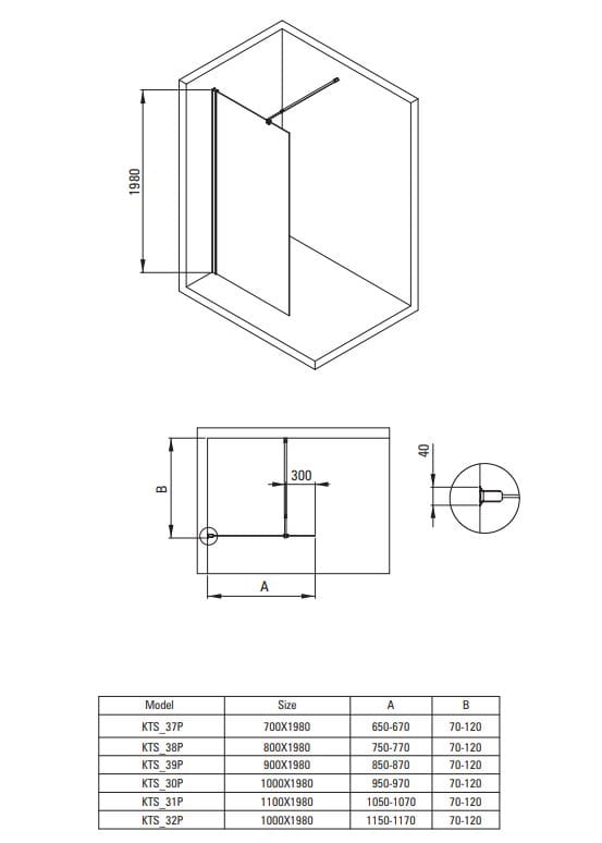 Montaż: Do kompletowania z drzwiami prysznicowymi KTS, walk-in KTS, możliwość montażu z ruchomym panelem KTS
