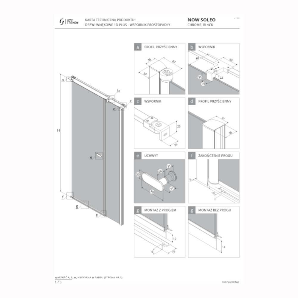 Model New Soleo posiada eleganckie, chromowane detale o wykończeniu w połysku. Drzwi prysznicowe, ze wspornikiem równoległym, wyposażone w bezpieczne, hartowane szyby o grubości 6mm, z powłoką ochronną Active Shield 2.0. Posiadają zawias kolumnowy, pozwalający uchylać drzwi na zewnątrz i do środka. Produkt może być instalowany z brodzikiem lub bez brodzika. Kolekcja objęta 3-letnim okresem gwarancji. Istnieje możliwość zamówienia produktu także w opcji na wymiar.