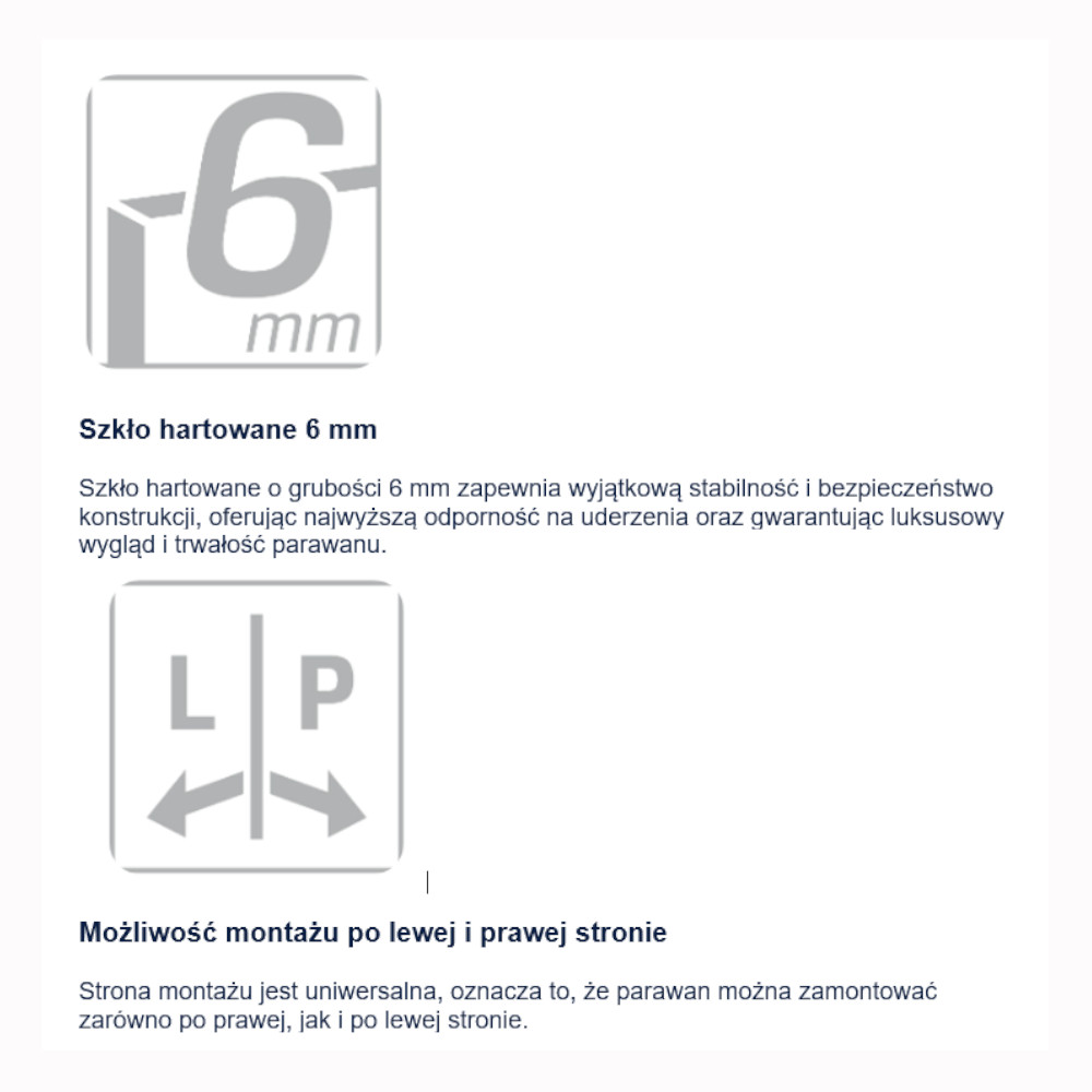 Szkło hartowane o grubości 6 mm zapewnia wyjątkową stabilność i bezpieczeństwo konstrukcji, oferując najwyższą odporność na uderzenia oraz gwarantując luksusowy wygląd i trwałość.