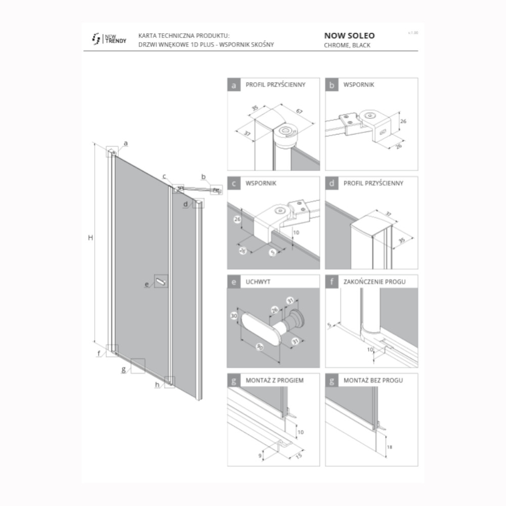 Model New Soleo posiada eleganckie, chromowane detale o wykończeniu w połysku. Drzwi prysznicowe, ze wspornikiem skośnym, wyposażone w bezpieczne, hartowane szyby o grubości 6mm, z powłoką ochronną Active Shield 2.0. Posiadają zawias kolumnowy, pozwalający uchylać drzwi na zewnątrz i do środka. Produkt może być instalowany z brodzikiem lub bez brodzika. Kolekcja objęta 3-letnim okresem gwarancji. Istnieje możliwość zamówienia produktu także w opcji na wymiar.