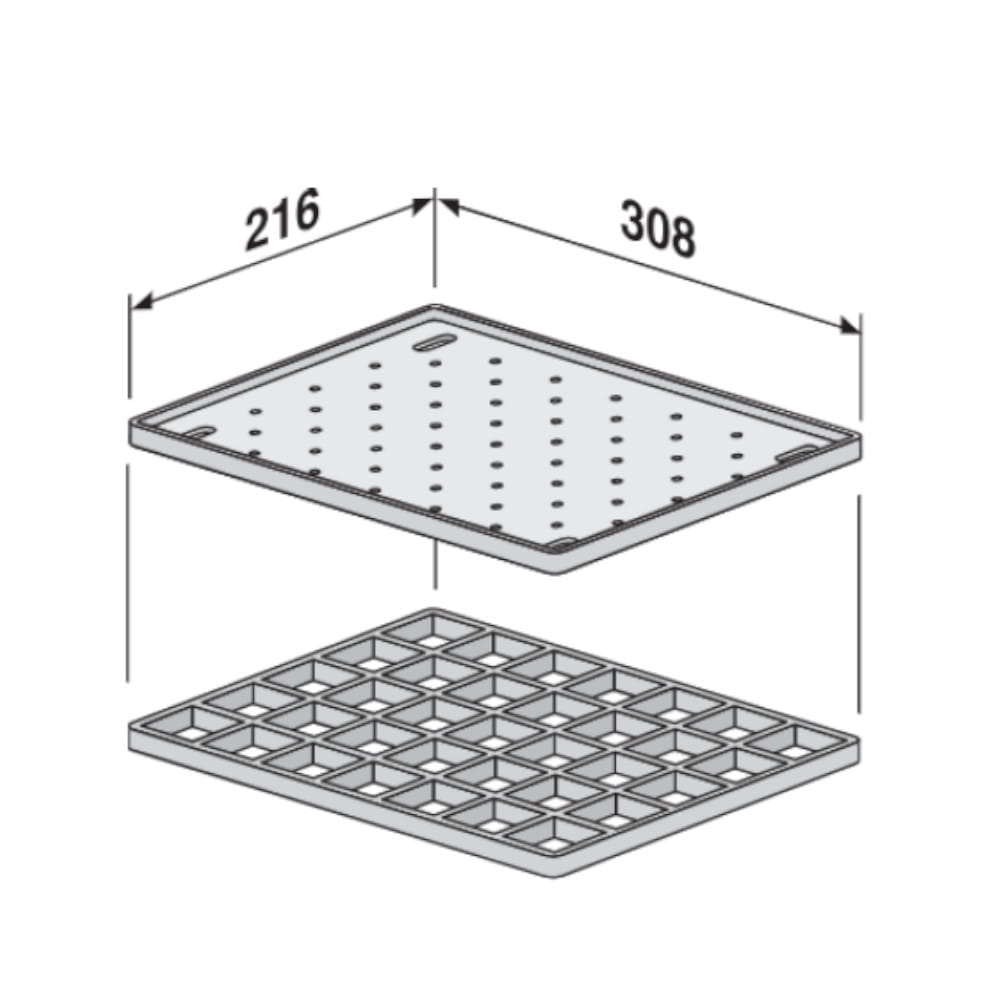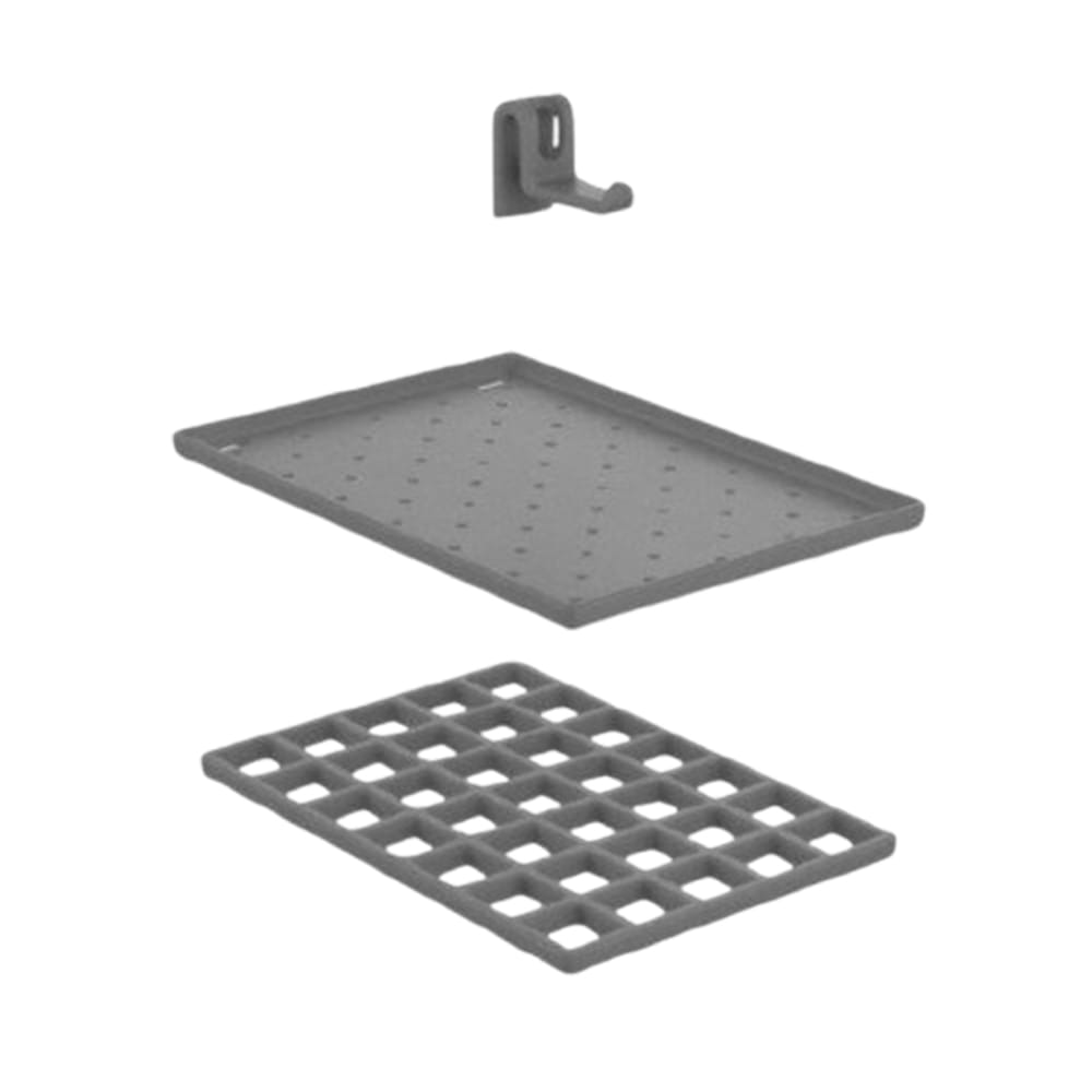 Zestaw składa się z kratki ociekowej i tacki, 4 haczyków do zawieszenia na listwie montażowej lub uchwytach na ręczniki po bokach zlewu. Haczyki mogą być również używane jako pojedyncze wieszaki. Zestaw zawiera kołki i śruby montażowe.